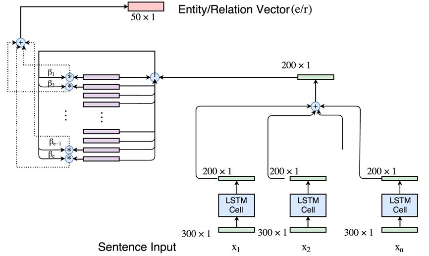 模型的输入是一组句中的词构成的词向量序列 x=[x_1, x_2,...,x_T],经过一个 LSTM 单元得到每个词向量的隐藏层状态 h_t = f(x_t, h_{t-1}),然后将得到的隐藏层状态向量加和平均得到 o = 1/T(\sum_{t=1}^{T}h_t)。根据可以计算上下文向量 C=ReLU(o^T W)。实体和关系对应的上下文向量分别与实体和关系的向量相乘,经过softmax操作,算出每个实体和关系的权重 \alpha_{e_i}, \alpha_{r_i}。其中,实体和关系的向量是通过DKRL模型(一种结合文本描述的知识图谱表示学习模型,论文链接https://aaai.org/ocs/index.php/AAAI/AAAI16/paper/view/12216/12004)计算得到。