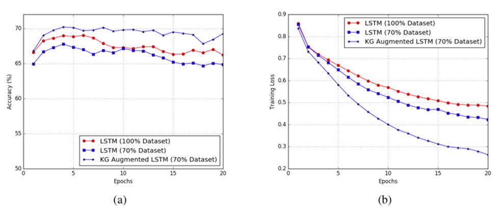 图(a)、图(b)分别表明,在SNLI数据集上训练的准确度和损失函数值。实验中分别比较100%数据集,70%数据集,以及70%数据集+KG三种情况输入的结果。可以发现,引入KG不仅可以降低深度学习模型对训练数据的依赖,而且还可以显著提高预测结果的准确度。此外,本文提出的方法对大量的先验信息的处理是高度可扩展的,并可应用于任何通用的NLP任务。