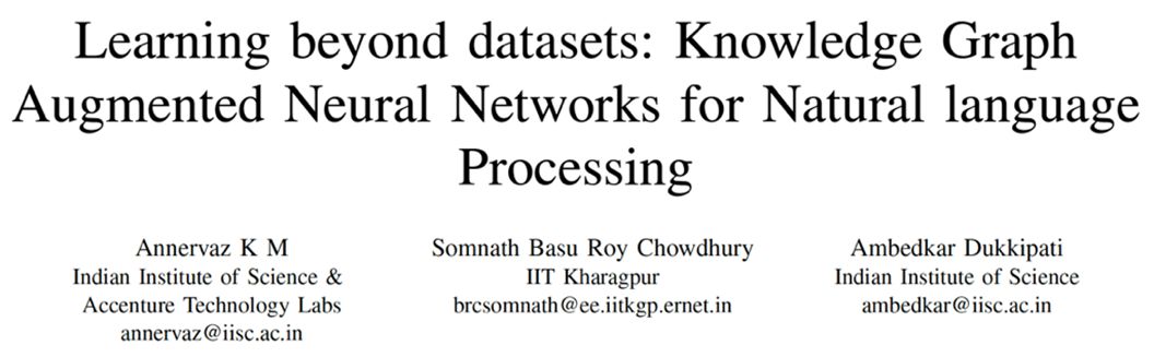 Citation: K. M. Annervaz, Somnath Basu Roy Chowdhury, and AmbedkarDukkipati. Learning beyond datasets: Knowledge graph augmented neural networksfor natural language processing. CoRR, abs/1802.05930, 2018.