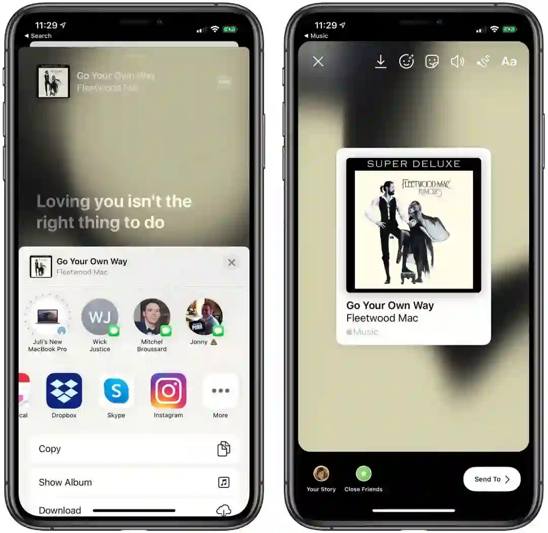 该更新包括一项新的 Apple Music 功能,该功能允许在 Instagram Stories 上共享 Apple Music 歌曲。在 Apple Music 中的歌曲上轻按“共享”按钮会创建一个具有歌曲标题,专辑名称和动画背景的故事,但是目前无法通过共享信息访问“Apple Music”。