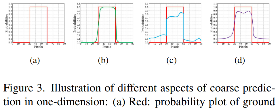 在提出优化模块之前,研究者定义了术语「粗略(coarse)」。在此,粗略包含两方面的意思:一种是模糊和有噪声的边界(如下图 3(b) 中 one-dimension(1D) 所示)。另一种情况是不均匀预测的区域概率(如图 3(c) 所示)。