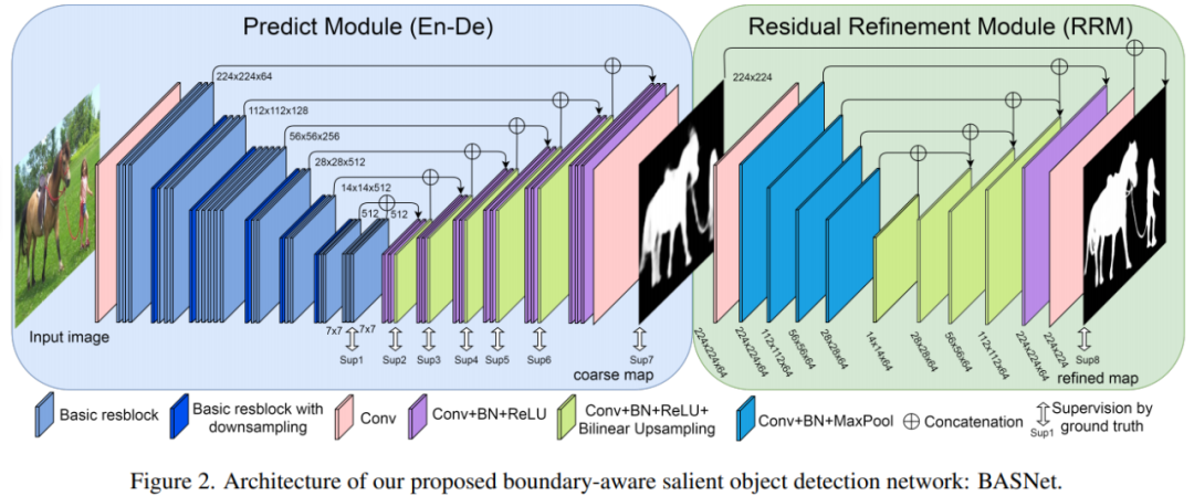 如下图 2 所示,本研究提出的 BASNet 包含两个模块,分别是预测模块(Predict Module)和残差优化模块(Residual Refinement Module, RRM)。