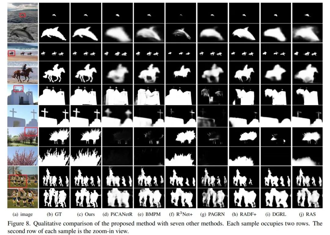 最后,为了进一步阐释 BASNet 的优越性能,研究者在下图 8 中展示了与其他 7 种同类方法的定性比较结果,可以看到,BASNet 可以对不同挑战性场景中的显著性目标实现准确分割。