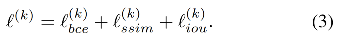 其中,ℓ^ (k)_ bce 表示 BCE 损失,ℓ ^(k)_ ssim 表示 SSIM 损失, ℓ ^(k)_ iou 表示 IoU 损失,这三种损失的影响如下图 5 所示: