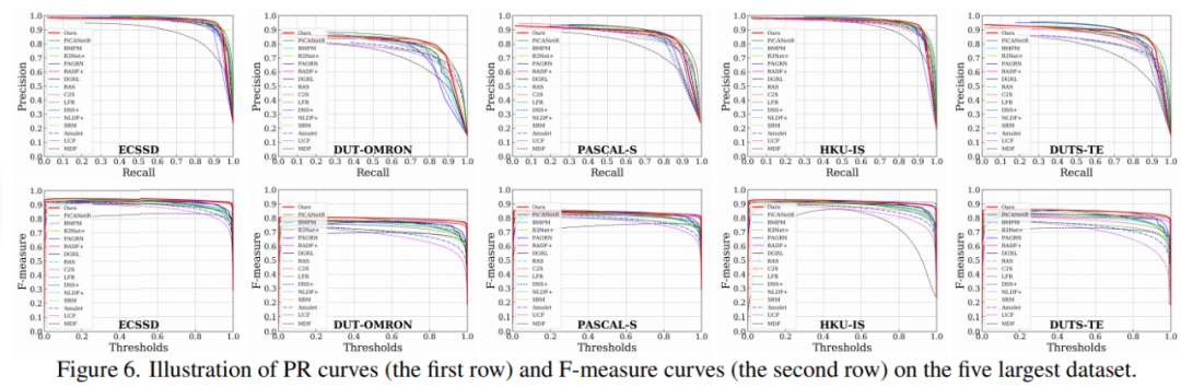 此外,为了评估分割显著性目标(salient object)的质量,研究者在图 6 中展示了 ECSSD、DUT-OMRON、PASCAL-S、HKU-IS 和 DUTS-TE 等 5 个最大数据集的 PR 曲线和 F-measure 曲线。