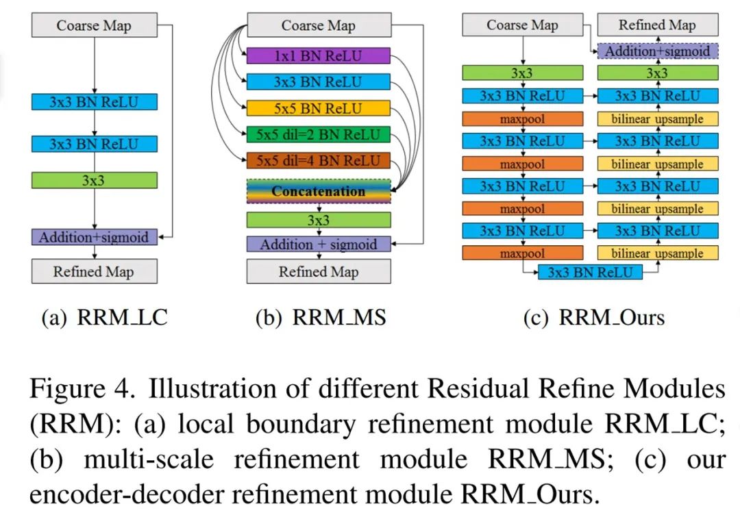 为了在粗略显著图中同时优化区域和边界,研究者提出了一种新的残差优化模块,它采用残差编码器 - 解码器架构 RRM_ Ours(如上图 2 和下图 4(c) 所示)。