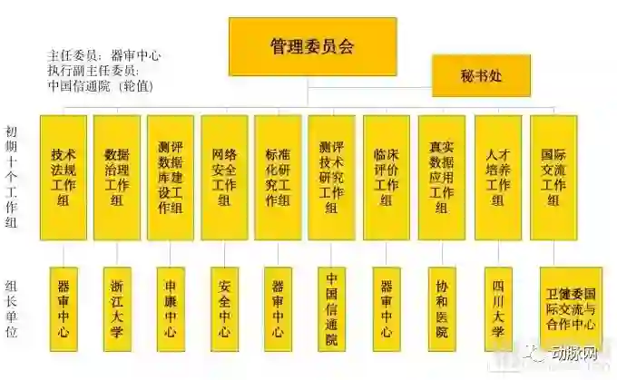 人工智能医疗器械创新合作平台由中央国家机关事业单位、学会、医疗机构与高校共同参与构成。管理委员会统一管辖下属10个初期工作组,各个工作组又由不同的机构参与管理。