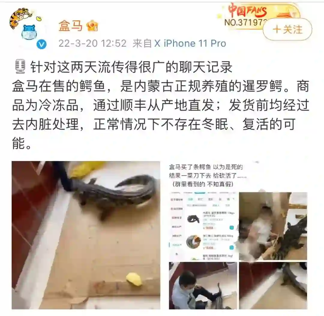 网传盒马所售鳄鱼被砍后复活,盒马官微回应:针对这两天流传得很广的聊天记录,盒马在售的鳄鱼,是内蒙古正规养殖的暹罗鳄。商品为冷冻品,通过顺丰从产地直发;发货前均经过去内脏处理,正常情况下不存在冬眠、复活的可能。(北青网)