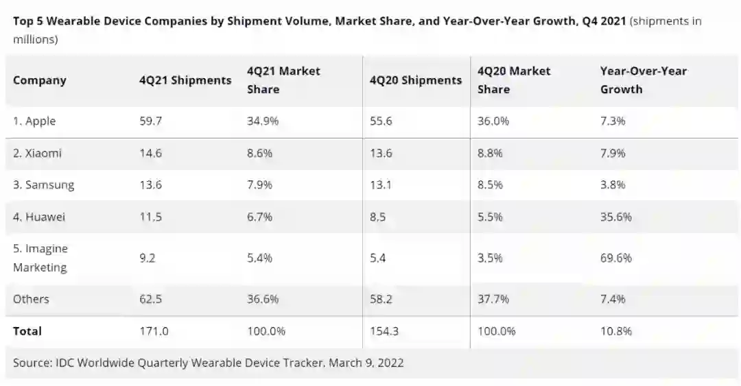 【2021年Q4可穿戴设备市场:苹果遥遥领先,小米第二】