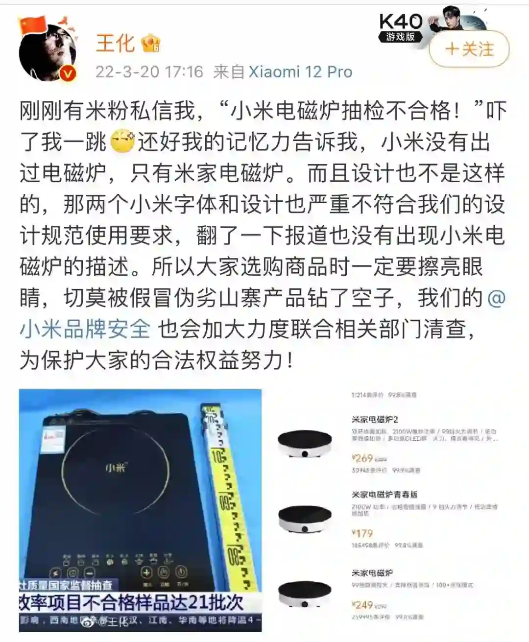 【央视报道出现“小米电磁炉”抽查不合格,王化:小米没有出过电磁炉】