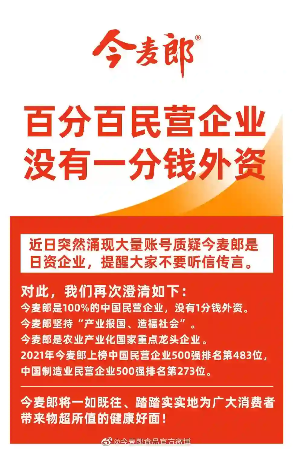 19日晚间,今麦郎食品官方微博发布澄清声明称,近日,遭受诸多不明真相的误伤、误读、误解,重申自身中国民营企业身份:百分百民营企业,没有一分钱外资。