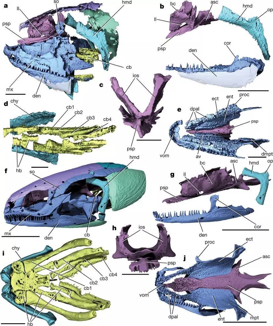 Fukangichthys longidorsalis(a-e,斯堪尼亚鱼类群)和Erpetoichthys calabaricus(f-j,属于多鳍鱼)头骨的高清CT扫描对比图。