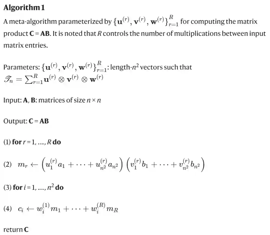 由此可以设计一种规则,一一对应地得到图(b)中的矩阵乘法算法,即论文中的「算法1」: