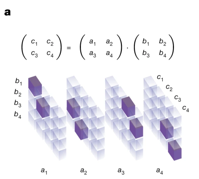 比如,c1=a1*b1+a2*b3,在「最深一层」所表示的c1上,可以看到左上方(第1行第1列)的a1b1,和第3行第2列的a2b3被表示为紫色1,其余为白色0。