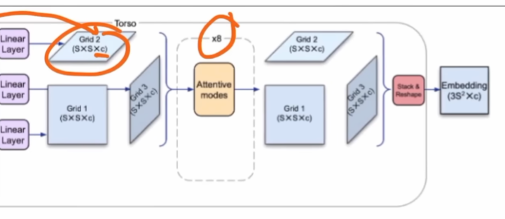 这是一个更精细的架构图。他们把最后一个时间步中出现的张量的历史,用各种方式把投影到这个网格层上,然后线性层Grid 2将其转换为某种C维向量(这里时间维度就减少了)。