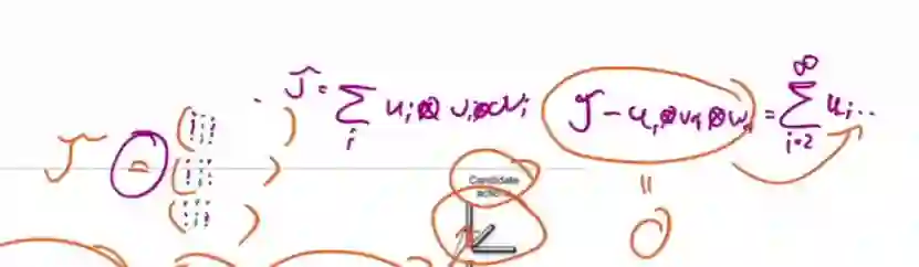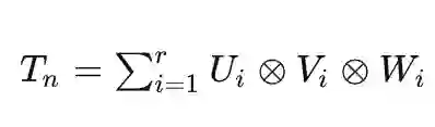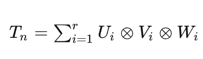 在张量表示后,可以通过对矩阵的「低秩分解」,设张量Tn为两个 n×n 矩阵相乘的表示张量。将Tn分解为r个秩一项(rank-one term)的外积。