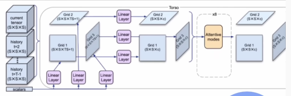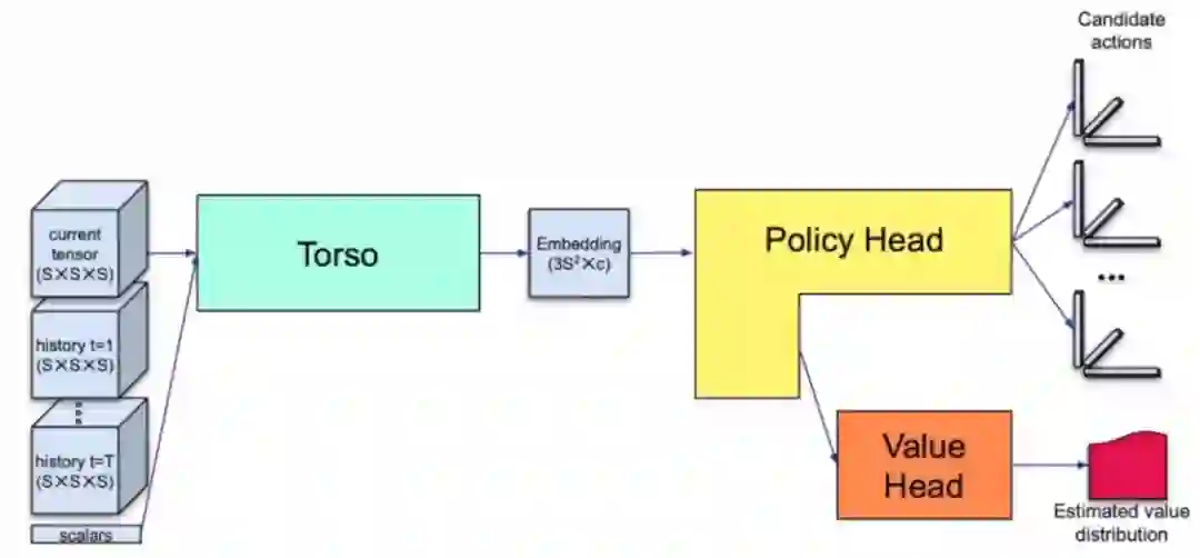 首先要输入当前的张量以及张量的历史,接着是躯干(Torso),然后是嵌入(Embedding),最后是Policy Head和Value Head。