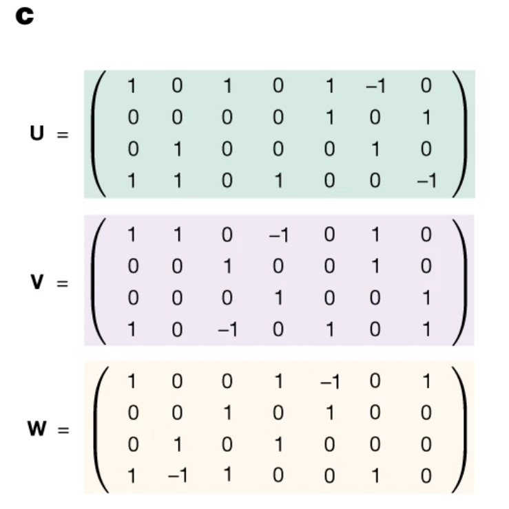 仍以Strassen的算法为例,低秩分解后的结果,即上式中的U、V、W对应为3个7秩矩阵。这里的分解矩阵的秩决定原矩阵乘法中乘法运算的次数。
