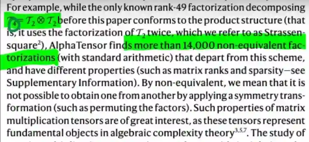作者还发现,对于两个四乘四矩阵相乘的得到的T4,AlphaTensor发现了超过14,000个非等价分解。