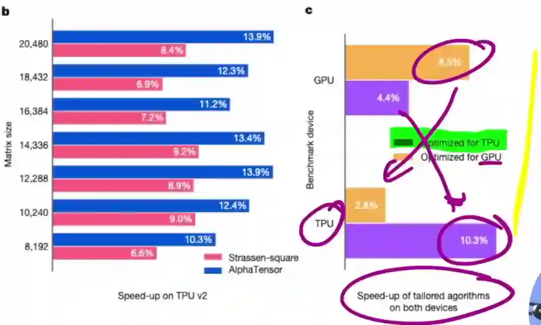 AlphaTensor当然不知道V100是什么,但通过强化学习的力量,我们就可以找到在特定硬件上速度非常快的算法。