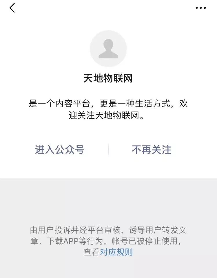 今年1月,该账号首次上榜即排78名。不仅如此,它还连续5个月位居在看榜榜首。不过好景不长,6月13日,「天地物联网」因用户投诉并经微信公众号平台审核认定存在“诱导用户转发文章、下载app等行为”,账号被停止使用。