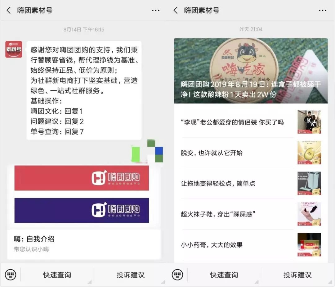 「嗨团素材号」每晚9点准时推送,一次发布8条团购素材。该账号无原创和留言功能,但每条推送阅读量稳定在3~5万,偶尔也有10w+。嗨团是一个清货平台,官方宣称,分销者只需发文案引导成交、统计订单,即可找上家结算现金红包。因为只是冷冰冰的素材,推送在看数基本不会超过50。