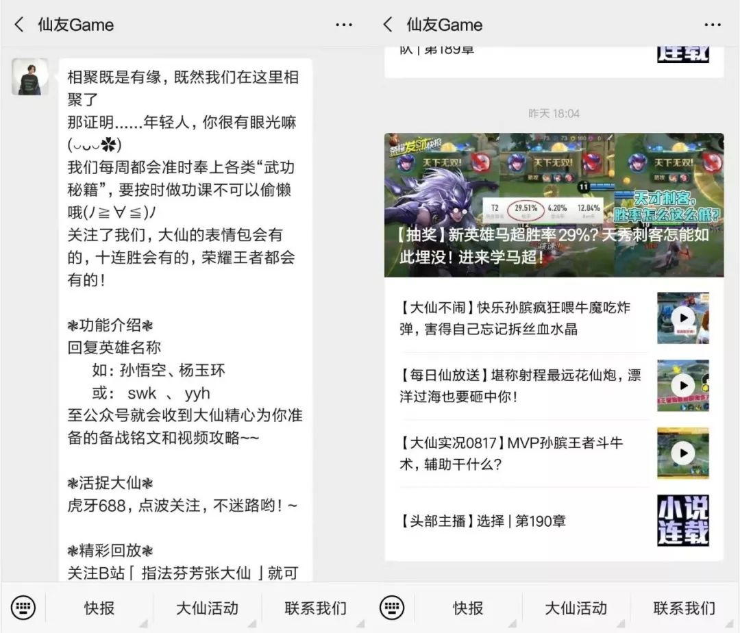张大仙最初从事电竞栏目的幕后工作,2016开始做《王者荣耀》游戏主播,历经企鹅电竞、斗鱼和虎牙平台。这个公众号注册于2018年3月,起初名为「仙友TV」,后改名为「仙友Game」,可见一开始就想做成机构号。