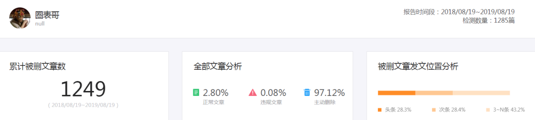 这个账号的运营情况比较“迷”。虽然每月都上榜500强,但只能看到近一周的完整推送。每天都有3条原创,但公众号主页显示的原创文章只有30篇。通过新榜“删文检测”工具查询,可知这一年来,该账号共删除1249篇文章——基本是“边写边删”的状态了。