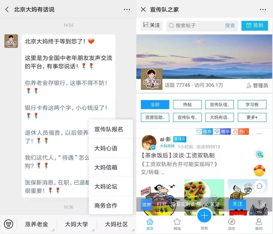 「北京大妈有话说」的slogan是“为全国中老年人发声”,除了每天推送6条中老年人关心的健康、生活、社保等信息,还建立了大妈社区、大妈大学。粉丝填写报名表,通过审核即可加入“宣传队”,官方表示加入这里,就能“认识全国的大妈”。
