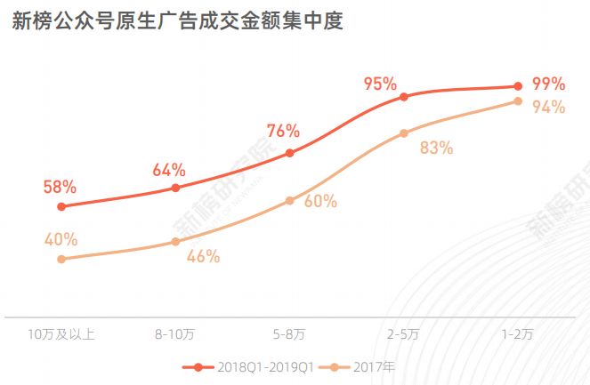 是的,从赚钱的角度,我们发布过类似报告。新榜广告平台的数据显示,2017年,刊例价1万元及以上的公众号拿走了94%的广告预算,最近一年多,这个比例上升到了99%。换言之,只有1%的广告预算,会给到刊例价几百上千的小号。