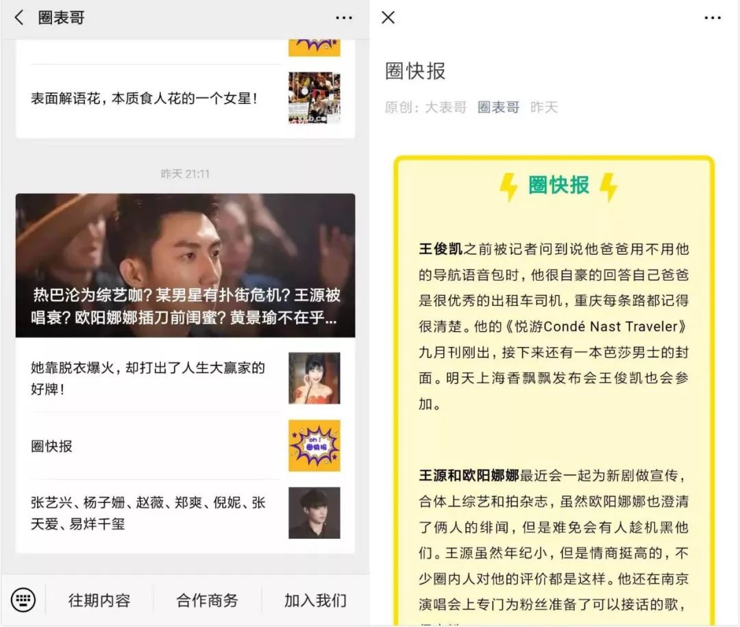 其中,「圈表哥」注册于2017年8月,起初名称为「最佳厕所读物」,几经更名后变成「圈表哥」,每天推送八卦消息合集。标题很有特色,头条由问句组成,如:《xx修复裂痕?xx很嫌弃自己老婆?xx奶xx?xx野心勃勃?xxxx复合实锤?》,末条则更直接,全是顿号衔接的明星名字。