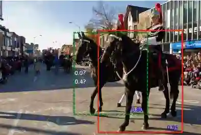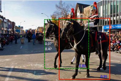 第一:如下图所示。红色框和绿色框是当前的检测结果,二者的得分分别是0.95和0.80。如果按照传统的NMS进行处理,首先选中得分最高的红色框,然后绿色框就会因为与之重叠面积过大而被删掉,这样就会造成漏检,导致检测精度下降。