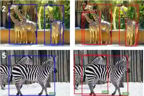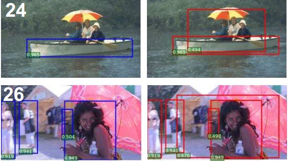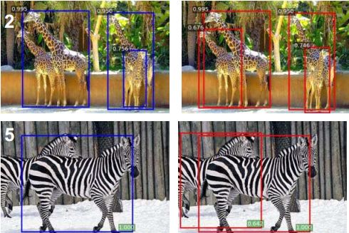 左边为NMS,右边为Soft-NMS。由上图可以看出,Soft-NMS检测效果好于NMS。