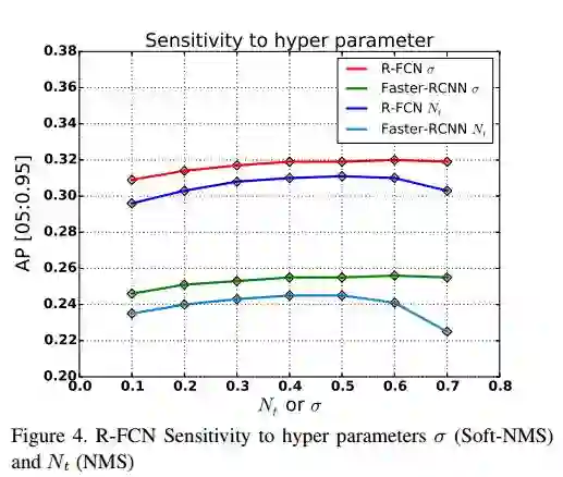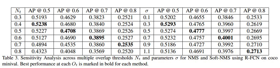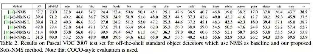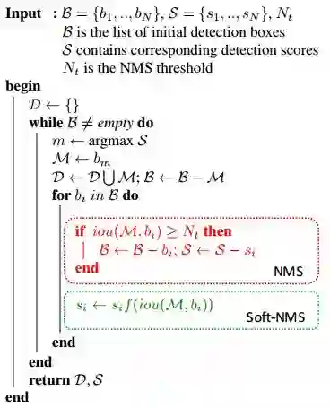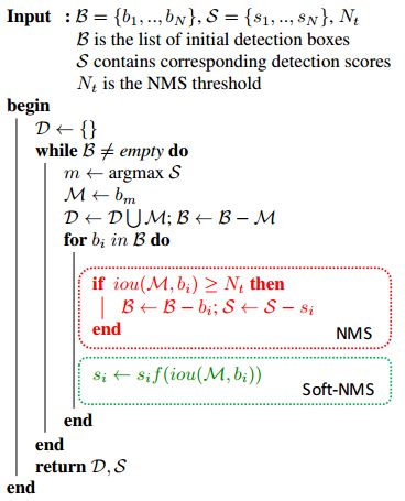 不是简单地删除所有IOU大于阈值的框,而是通过用一种IOU的函数来降低其置信度。简单来说,就是如果两个框重叠面积越大,则它的置信度(分数)应该降的越多,因为它成为假正样本的概率更大,反之。算法流程如上图所示。由于这种改进,没有引入多余的参数,也没有增加计算量,也不需要额外的训练,但是实验效果表明,确实可以提高检测精度,因此,可以广泛应用于检测中。
