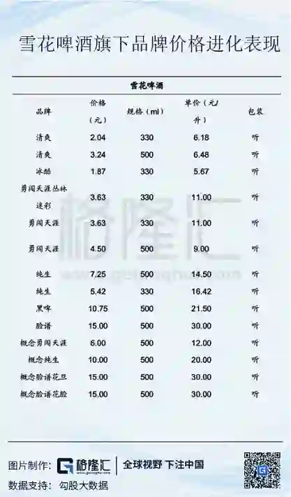 2.高端化:啤酒的高端化趋势是我们在消费啤酒的过程中能感受到的另一大变化。以华润啤酒的雪花品牌为例,近十年来酒桌上就就经历了从雪花冰霜,到雪花原汁麦,到雪花勇闯天涯,再到雪花纯生,最后又出现雪花脸谱的过程。从价格带上来看,大家喝啤酒的品质就是逐渐走向高端化的。这发展的背后,实际上餐饮店的雪花啤酒也经历着这样的“进化”,现在很多一二线城市的餐饮店,最抵挡的已经是雪花纯生了。