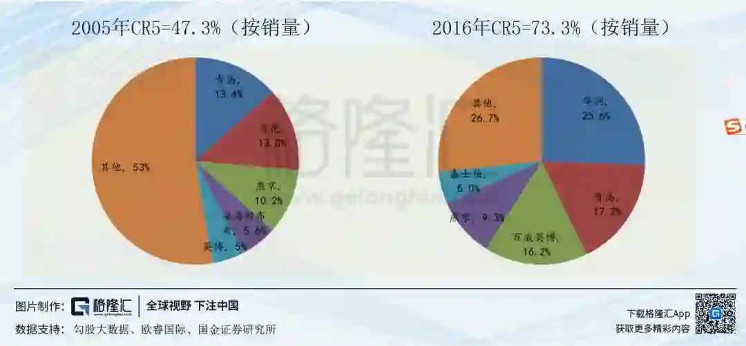 3.竞争改善:啤酒行业一直以来最大的特点之一就是竞争激烈。对于绝大多数消费者来说,似乎不同品牌之间同等价位的啤酒并没有什么差别。然而实际上,中国啤酒行业的集中度是在逐渐提升的,这10年来,很多地方品牌基本已经被抢占了绝大部分份额。目前国内啤酒行业的集中度已经达到了CR5占75%左右。