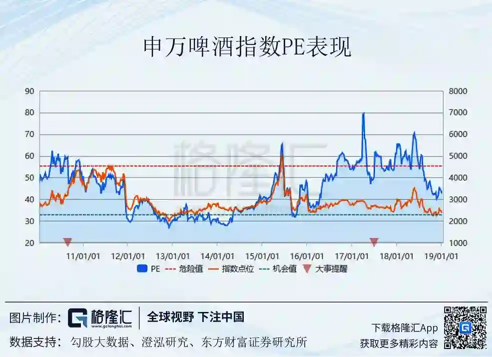 2.高估值:啤酒版块的估值水平长期处于高位。作者认为原因主要有两点:第一点是啤酒属于快消品属性,消费品行业中快消品会享受一定的估值溢价;第二点是啤酒行业净利润率比较低,各个环节的改善能够给啤酒企业带来的业绩弹性会比较大。比如大家一直对啤酒行业存在的提价预期、费用率降低的预期或者18年年底的成本下降预期,都会反映在啤酒企业的估值中。所以,啤酒行业的高估值和一直以来存在的预期难以兑现的情况都是投资人难以下定决心的原因。