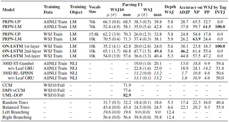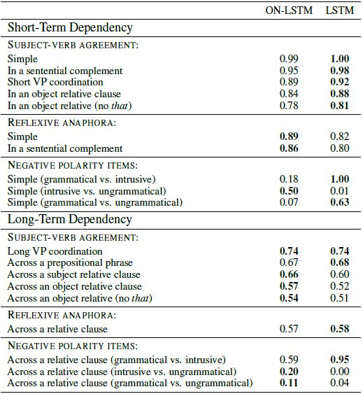 总的来说,本文的研究集成树结构到 LSTM 网络中,并通过归纳偏置和 cumax 函数,构建一种新颖的 ON-LSTM 模型,在多项 NLP 任务中都取得了不错的性能表现。