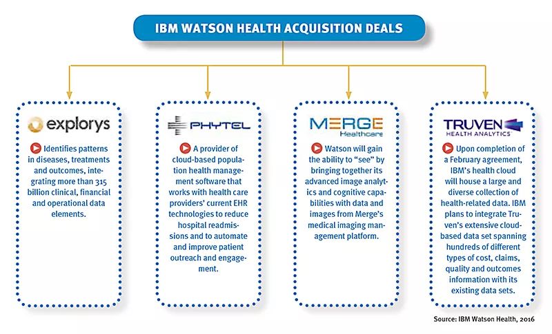IBM 收购了 Phytel、Explorer 和 Truven 三家公司,它们的病人信息数据库和数据分析能帮助医生和保险公司提供更有效的护理。Watson 希望利用这些资产帮助医疗系统从传统的收费服务模式向奥巴马医改所强调的基于价值的新模式转变。在新的模式中,医疗保健系统并不为每一次的治疗付费,而是为保持病人的健康付费。