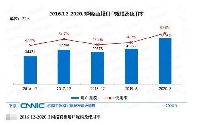 第45次《中国互联网络发展状况统计报告》显示,截至2020年3月,国内网络直播用户规模达5.6亿,较2018年底增长1.63亿,占网民整体的62%。