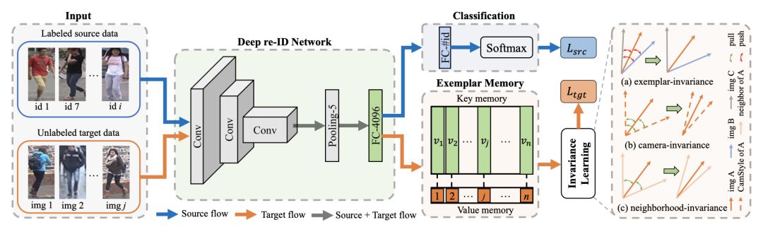 本篇工作针对目标数据集提出了三种潜在的域内不变性(样例不变性,相机不变性和邻域不变性)。与此同时,作者提出了一个基于样例的记忆模块,使得在模型训练过程中能够有效的引入提出的三种不变性限制。实验表明,该方法在三个行人再识别跨数据集场景下取得了当前最好的结果,并大大的超过了现有的方法。