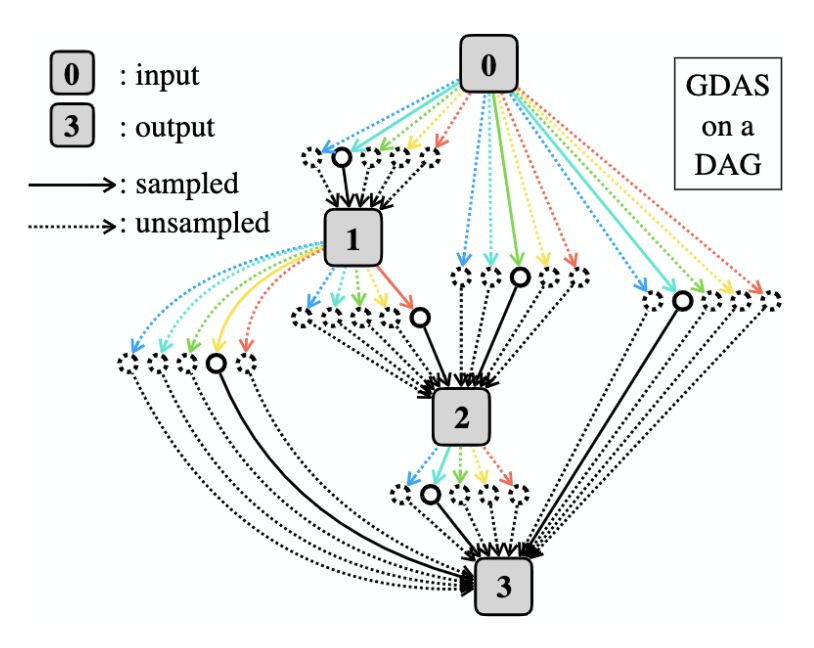GDAS 将整个搜索空间用一个有向无环图(DAG)来表示。针对这个 DAG,GDAS 设计了一个可微的采样器,GDAS 在训练集上优化 DAG 内每个网络结构的参数,在验证集上优化这个可微的神经网络采样器。实验表明,在一个 GPU 上,通过几个小时的搜索时间,GDAS 就可以在 CIFAR-10 数据集上找到一个高性能的网络结构。
