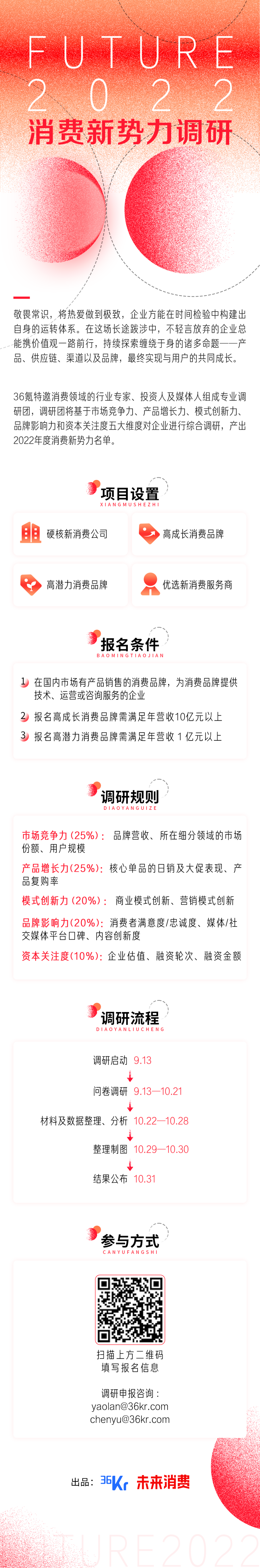 基于此,36氪未来消费正式启动「FUTURE 2022」消费新势力调研,将通过桌面研究、问卷调研、机构走访等形式深度了解市场动态,找出代表中国消费细分领域趋势的创新者们,分别入选「硬核新消费公司」、「高成长消费品牌」、「高潜力消费品牌」以及「优选新消费服务商」。