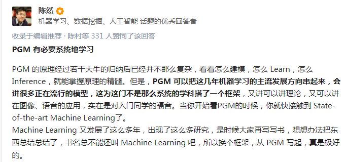 PGM作为机器学习的重要框架,奠定了统计机器学习的基础。在深度学习的统治江湖的时代,概率图模型有没有必要系统学习一下呢?知乎上这个问题获得了19万的浏览量,大家在强调PGM重要性的同时,将其誉为最优美的机器学习框架之一,系统学习PGM是深入理解机器学习发展脉络与知识体系的必备基础。
