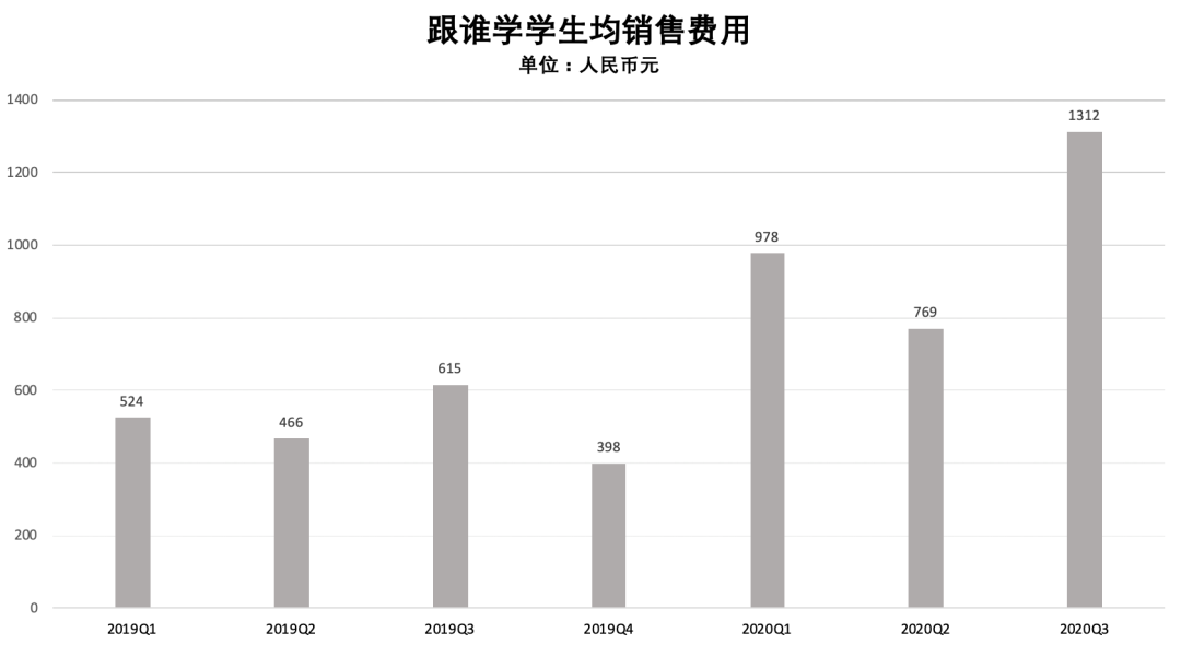 到了2020年Q3,跟谁学在线直播大班课正价课付费人次达156.7万,算下来,单个学生的平均销售费用达到了1312元。