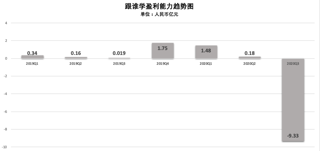 但最新财报数据却表明,跟谁学的增长引擎正在失灵。11月20日,跟谁学发布2020财年Q3财报,连续九个季度盈利的局面就此终结。巨额亏损下,市场情绪遭到严重冲击,当日跟谁学盘中最高大跌22%。