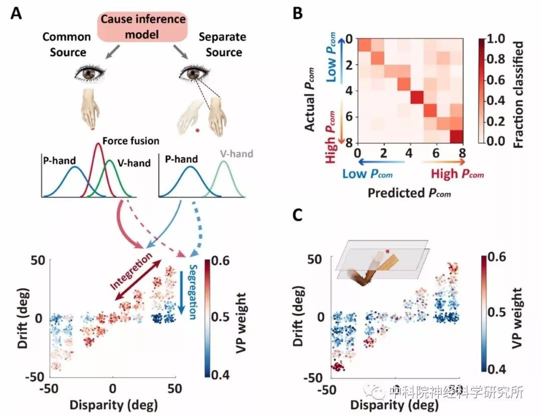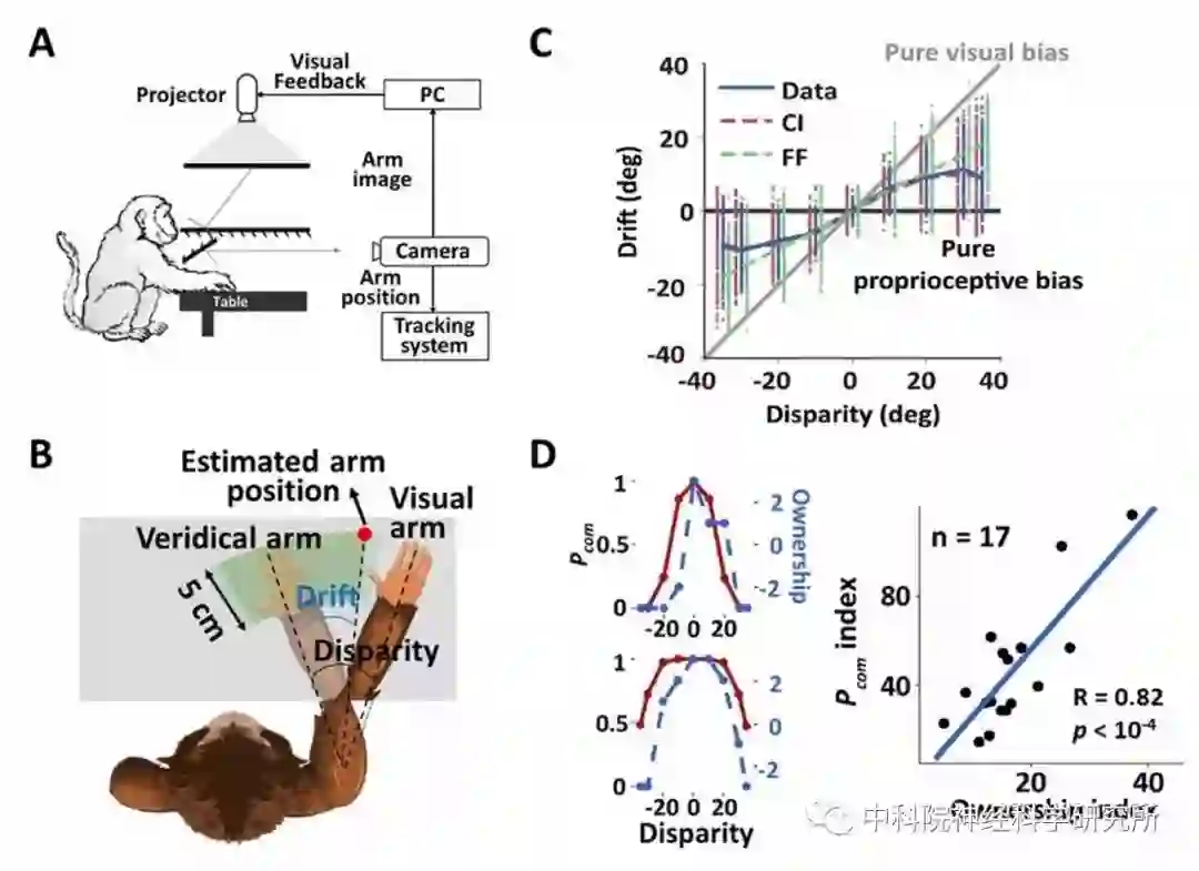 为了进一步定量的描述手臂拥有感与本体感觉偏移以及视觉-本体感觉信号输入之间的关系,研究人员利用贝叶斯因果推理模型对人和猕猴的行为结果进行了拟合(图1D)。该模型认为当视觉-本体感觉信息的空间位置越接近,大脑认为两者来自同一来源(common source)的概率越高,从而有更高的概率认为视觉手臂和本体感觉手臂两个信息来自同一来源,那就自我的身体(图2A)。拟合结果显示,人和猕猴对手臂视觉-本体感觉信息的整合都符合贝叶斯因果推断理论,并且模型所预测的视觉-本体感觉来自同一来源的后验概率(Pcom)与人类被试通过问卷汇报的身体拥有感打分存在显著的相关性。这些结果第一次发现,通过客观的行为学指标可以定量地测量猕猴对手臂的主观拥有感。