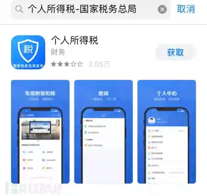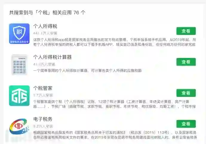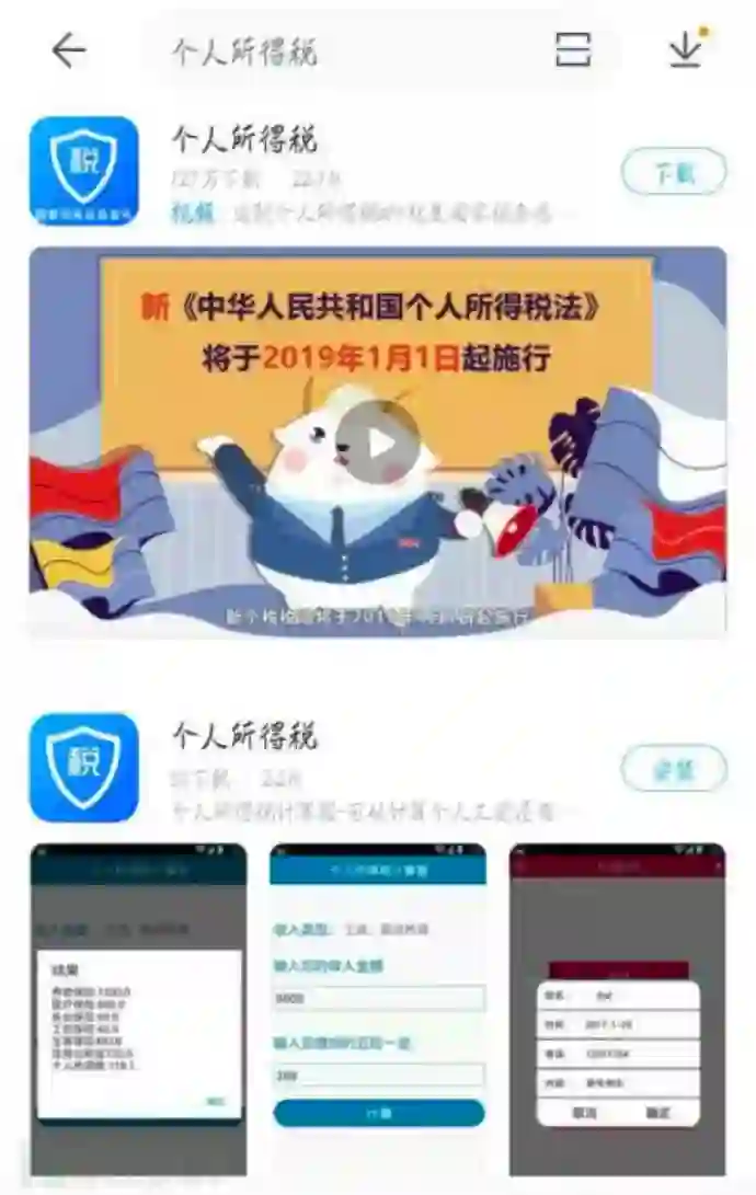 我们以关键词“个税”进行搜索时,出来的第一个并非国家税务局官方出品的APP。