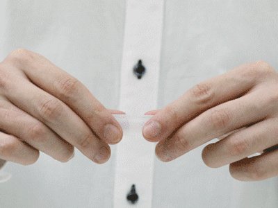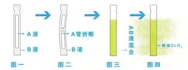 折一下,内胆破裂,A液体和外面包裹的B液体就会充分混合,变成稳定的二氧化氯水溶液,往外释放二氧化氯气体。