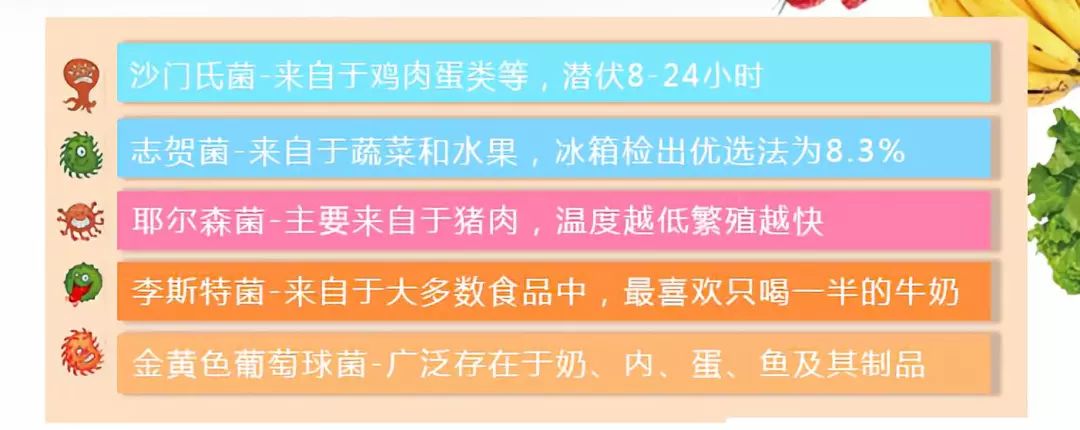 如沙门氏菌、志贺菌,蔬菜、水果、牛奶、鸡蛋......几乎所有的冰箱中的食物都无法幸免。